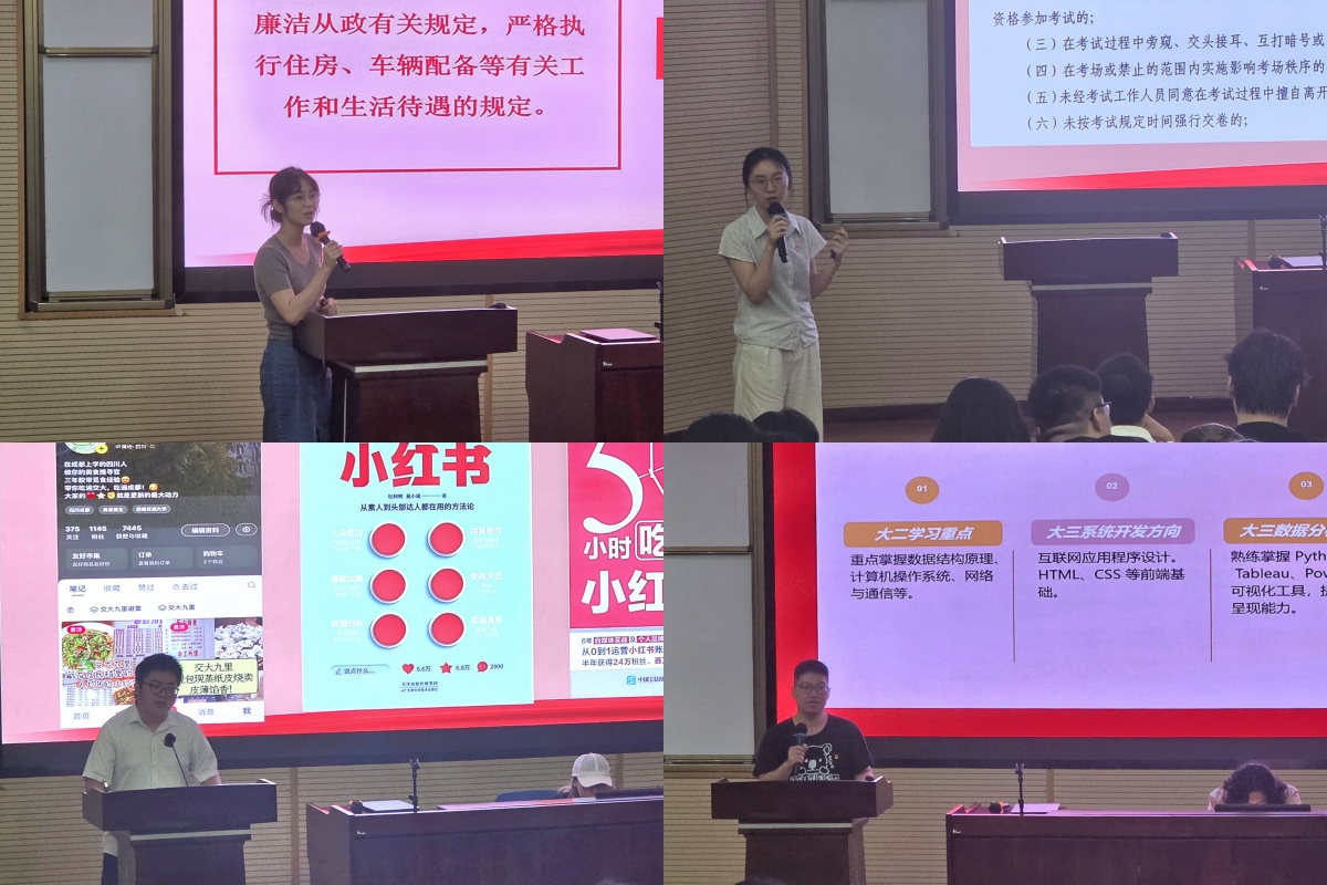 第四党支部副书记钟文婷同志带领全体党员系统学习规定内容,并结合典型案例展开警示教育。第三党支部副书记王重月同志领学《beats365官方网站本科生考试违规处理办法》,以制度条例和真实事例敲响纪律警钟。第三党支部党员刘芫硕同志结合自身经历,分享其在自媒体运营上从兴趣挖掘到内容创作的全过程。第四党支部党员杭麟奇同志则围绕自身技能提升与学习实践,推荐了一系列有助于提升专业能力和综合素质的技能。两位党员强调在学业与生活中要坚守纪律底线,以严谨的态度对待学习和实践。最后,支部全体成员庄严签订《诚信考试承诺书》。